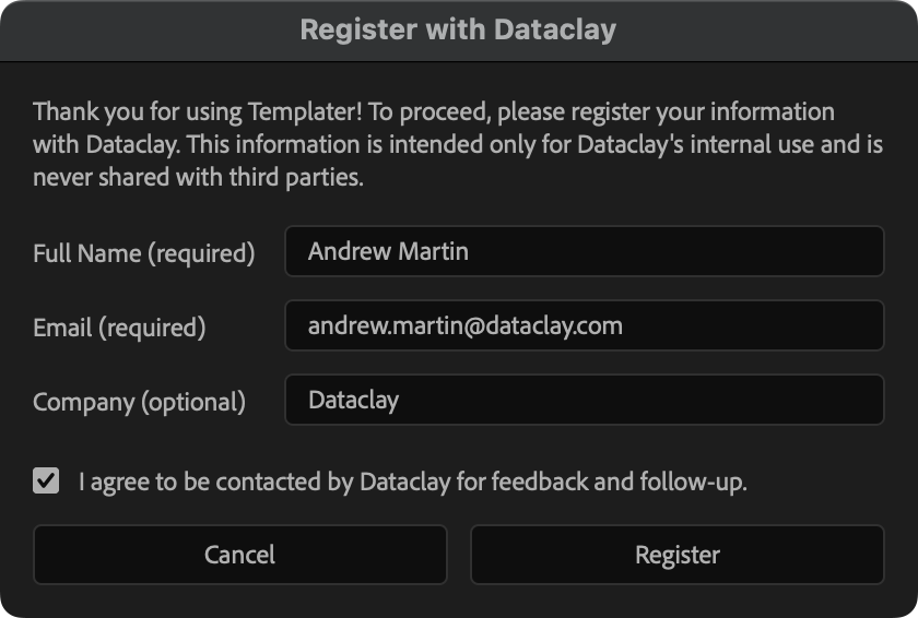 dialog will appear. Your full name and email address are required while your company name is optional. You