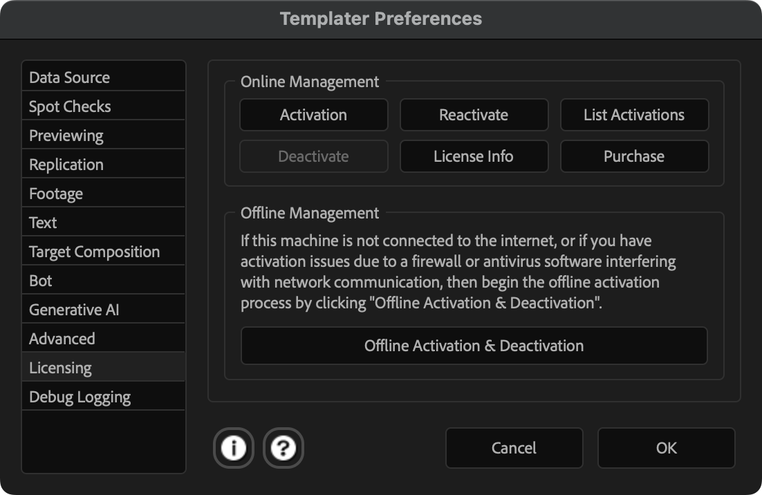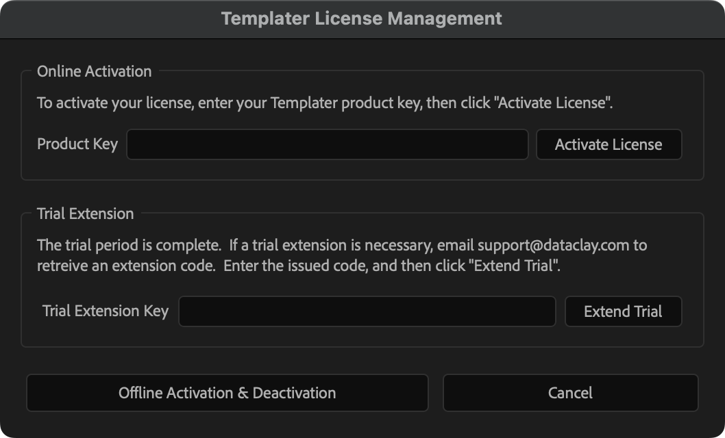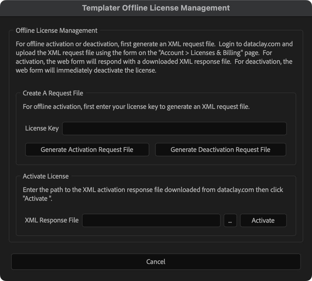 - Back in After Effects, if the Templater Offline License Management dialog is not already open, open it by repeating steps 1 through 3.