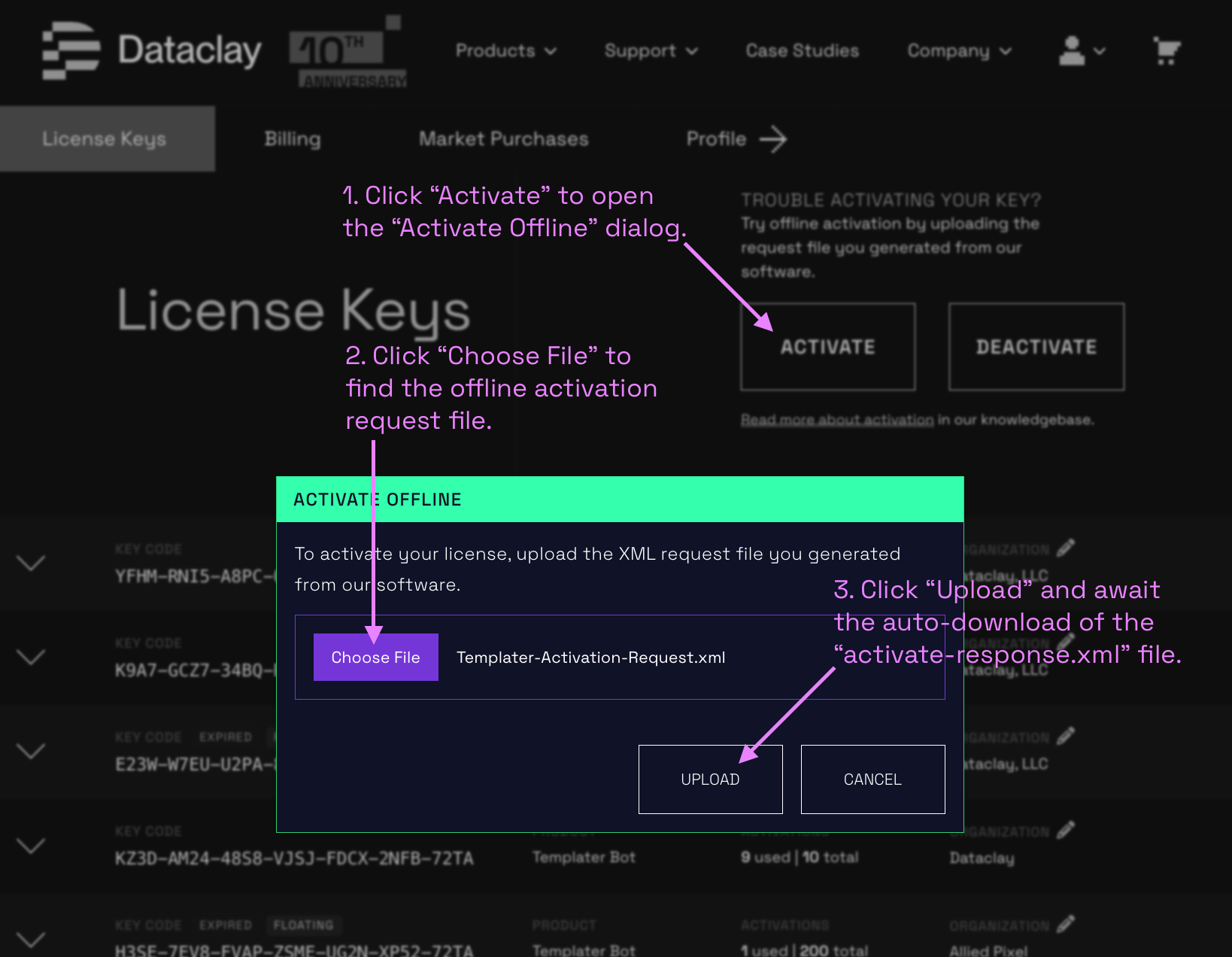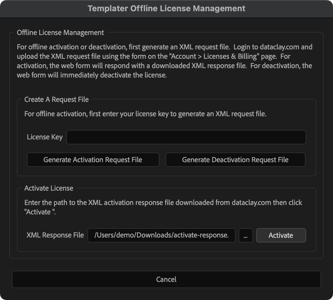 - Click Activate. Then click Choose File and select the Templater-Activation-Request.xml file you